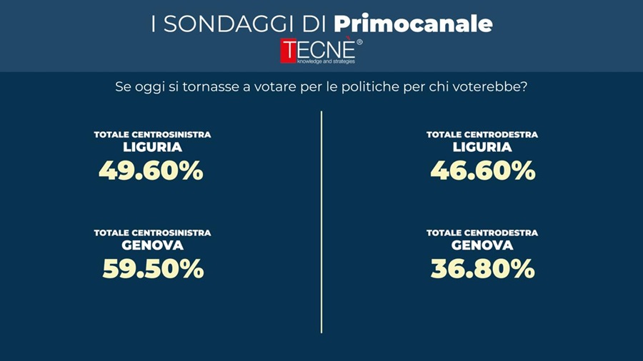 Un nuovo sondaggio realizzato da Primocanale in collaborazione con l'Istituto di ricerca Tecnè offre una fotografia aggiornata del panorama politico a Genova e in Liguria. Nello stesso periodo proprio Tecnè ha fatto un'indagine nazionale e quindi abbiamo potuto mettere a confronti i tre dati: comune di Genova, Regione Liguria e nazionale.