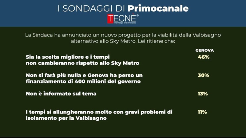 Lei sig.ra Sindaca ha un grande credibilità verso i cittadini e il nuovo sondaggio Tecnè Primocanale sullo Skymetro dimostra come sia riuscita a modificare il pensiero di gennaio dei genovesi. Ben il 46% dei cittadini ritiene infatti oggi che Lei abbia fatto bene a cancellare l'opera, ma Le credono anche quando lei dice che li tempi del suo nuovo progetto non cambieranno rispetto al progetto esistente e finanziato integralmente.