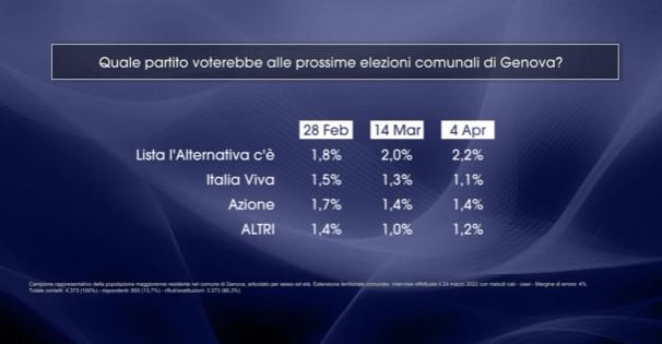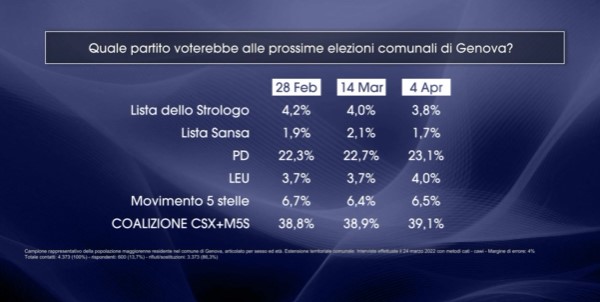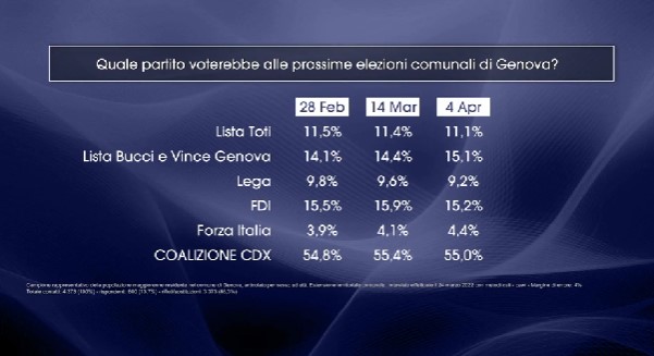 Per quanto riguarda le singole liste il primo partito resta il Pd con il 23,1% di sostegno secondo il sondaggio con un aumento rispetto all'ultima rilevazione del 14 marzo scorso dello 0,4%. Il secondo partito per preferenza è Fratelli d'Italia con il 15,2% che però perde uno 0,7% rispetto al precedente sondaggio. Subito dopo ecco la Lista Bucci con il 15,1% (+0,7%), poi la Lista Toti con l'11,1% (-0,3%), quindi la Lega al 9,2% (-0,4%). Il Movimento 5 Stelle si attesta al 6,5% con un dato pressoché invariato (+0,1%), quindi Forza Italia al 4,4% (+0,3%), Leu al 4% (+0,3%), la Lista Dello Strologo segna il 3,8% delle preferenze (-0,2%) mentre sempre nella coalizione di centrosinistra la Lista Sansa passa dal 2,1% al 1,7%.