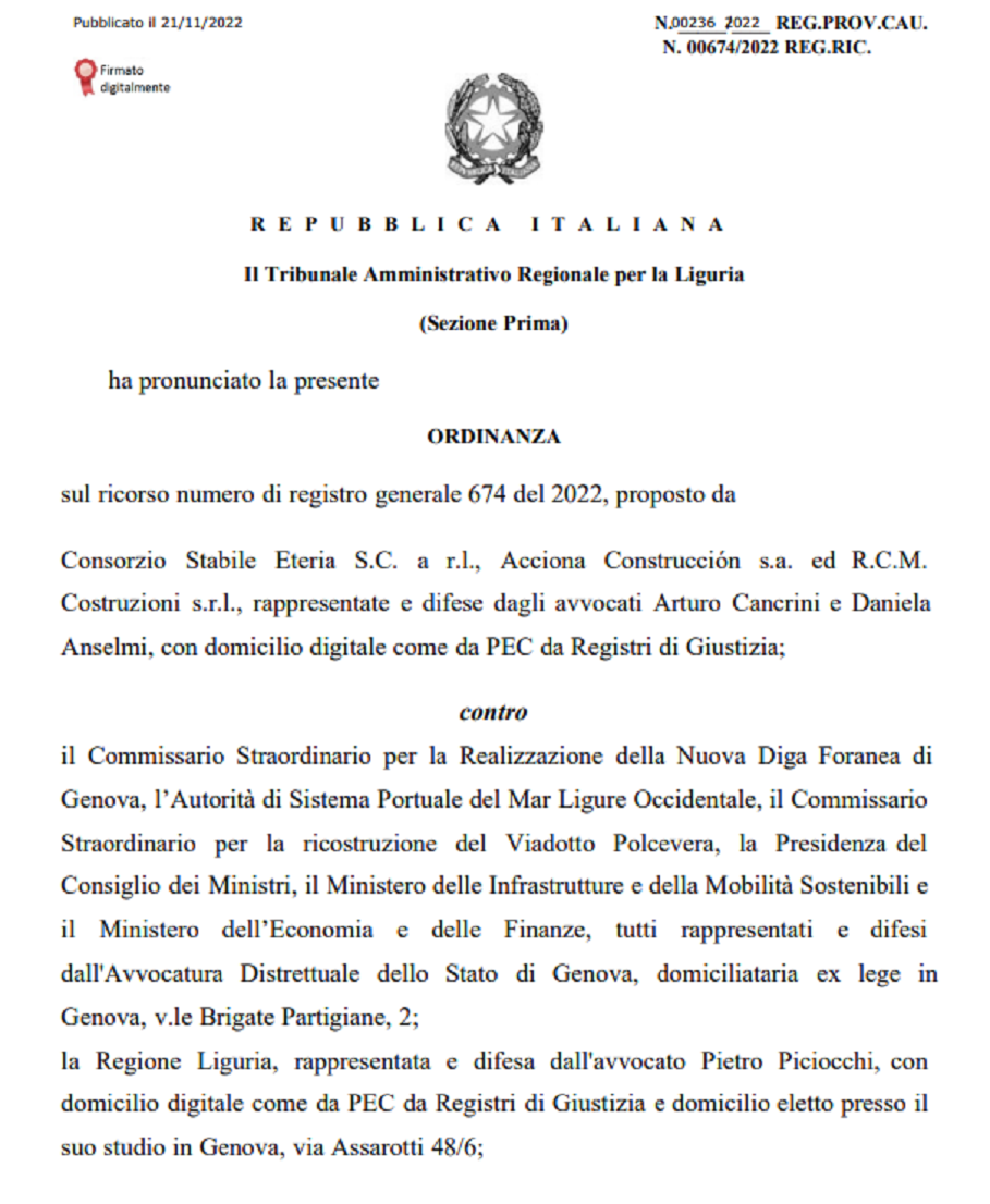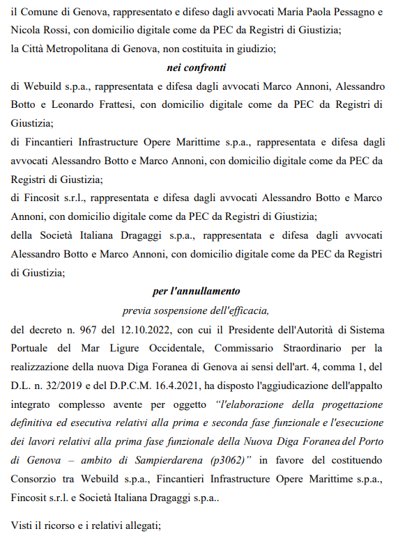 Il ricorso era stato presentato contro il Commissario Straordinario per la realizzazione della Nuova Diga Foranea di Genova Paolo Emilio Signorini, l'Autorità di Sistema Portuale del Mar Ligure Occidentale, il Commissario Straordinario per la Ricostruzione, la Presidenza del Consiglio dei Ministri, il Ministero delle Infrastrutture e della Mobilità Sostenibili, il Ministero dell'Economia e delle Finanze, la Regione Liguria, la Città Metropolitana di Genova, il Comune di Genova.