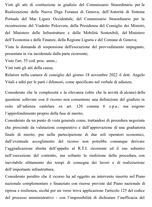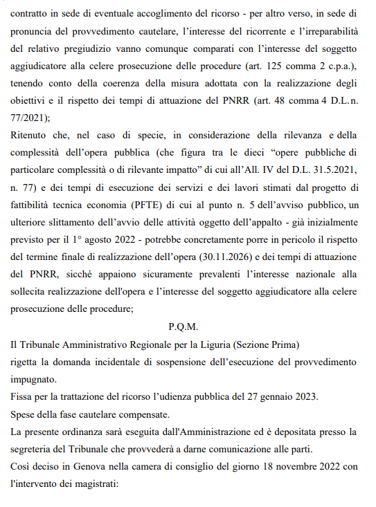 Le motivazioni facevano riferimento anche al fatto che il decreto di aggiudicazione riguardava un'opera pubblica di "particolare complessità e di rilevante impatto finanziata in parte con risorse del Pnrr e inserita nel Piano nazionale complementare", richiamando la normativa speciale per questi appalti prevista per legge. Il giudice amministrativo aveva accolto la domanda di misura cautelare presentata dalla cordata sconfitta per l'opera e aveva sospeso l'esecuzione del decreto di aggiudicazione del 12 ottobre 2022, ai soli fini della stipulazione del contratto, fissando per la trattazione collegiale della domanda cautelare la camera di consiglio, quella di venerdì, appunto.