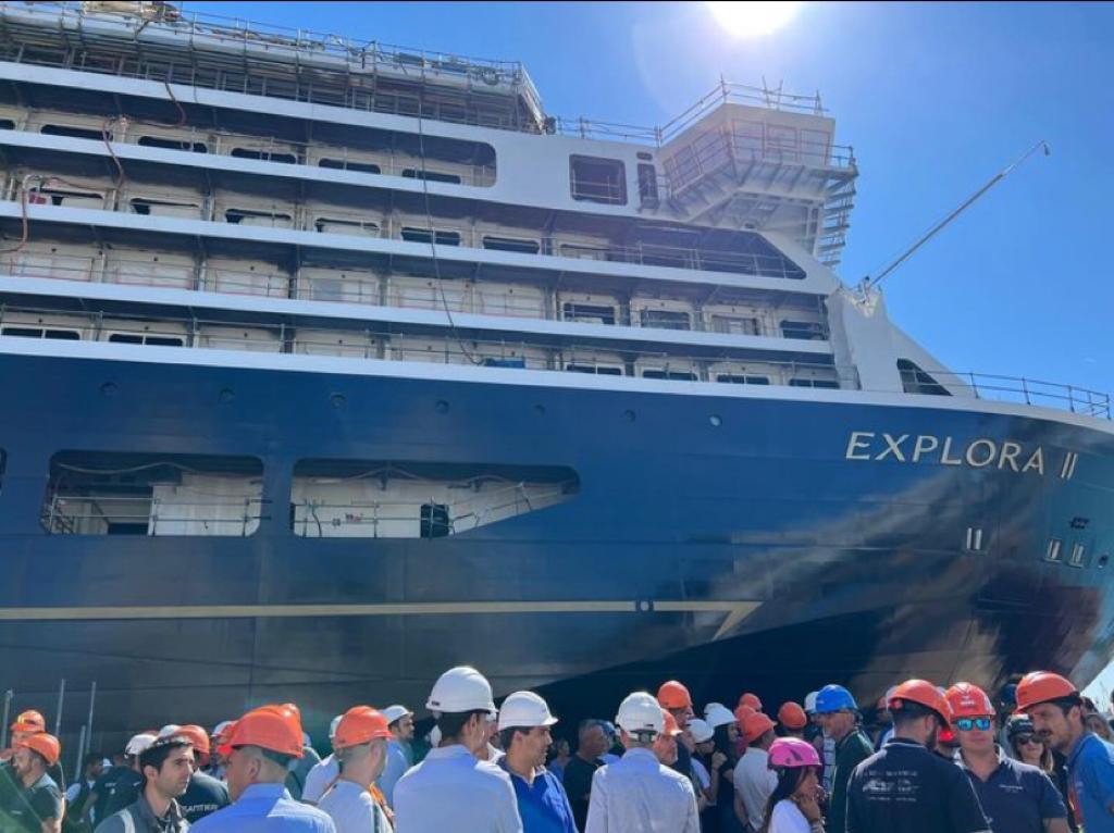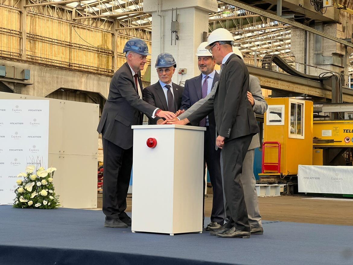 Nel cantiere Fincantieri di Sestri Ponente a Genova la doppia cerimonia di messa in acqua per la nuova Explora II e del taglio della lamiera della terza nave in produzione, la Explora III.